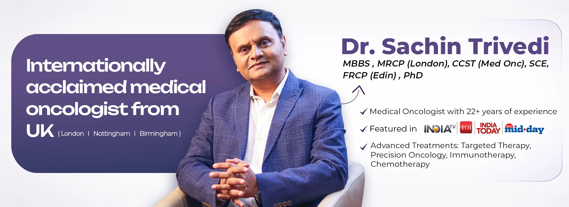 Dr Sachin Trivedi is an 22 + Years of experienced internationally trained medical oncologist in Mumbai, known for providing advanced treatment for a wide range of cancer conditions. As a trusted oncologist in Mumbai, he focuses on delivering patient-centered care and evidence-based treatment plans.Patients seeking expert care for cancer diagnosis and treatment can consult Dr Sachin Trivedi for professional guidance and comprehensive oncology care.
